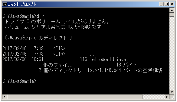 移動したフォルダに保存したJavaのファイルがあるかをdirコマンドで確かめよう。