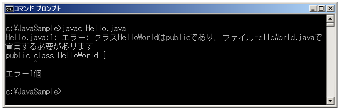 このエラーは、ソースファイルに記述されているクラス名が「HelloWorld」であるのに対し、ファイル名を「Hello.java」としたために発生している。