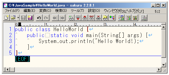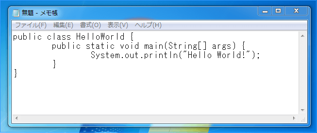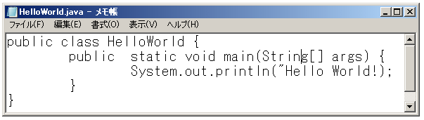 このファイルを「HelloWorld.java」という名前をつけて先ほどのフォルダに保存する。