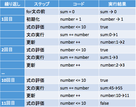 最初は、sumが0で初期化される。その後からfor文が始まる。繰り返しの1回目だけ初期化が行われ、式の評価、文の実行、更新と続く。最後は繰り返しが11回目のとき、式のnumberが10を超えるので評価がfalseになり、繰り返しは終了する。