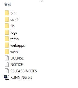 重要なのは bin,conf,logs,webappsの各フォルダだ。そのほかはTomcatのAPIなどライブラリが入っているので、動かす際に触ることはない。