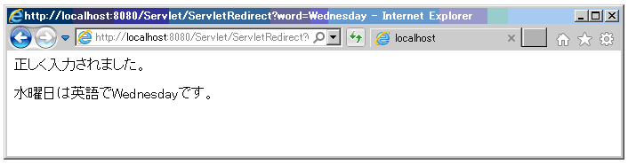 - [10]-[13] PrintWriterオブジェクトに「正しく入力されました。」と「水曜日は英語でWednesdayです。」を表示するHTMLコードを出力する。