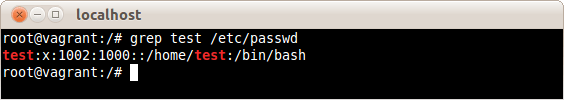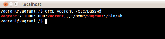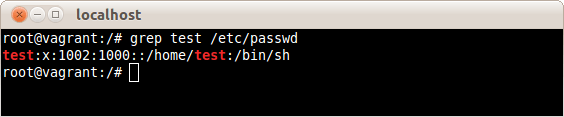 /etc/passwdファイルでユーザーvagrant詳細情報を確認し、ログインシェルが指定したものになっているか確認する。