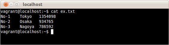 $ echo -e "No-1\tTokyo\t1354098\nNo-2\tOsaka\t934765\nNo-3\tNagoya\t786592" > ex.txt