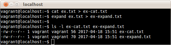 しかし、catコマンドでファイルに内容を出力したものと、expandコマンドでファイルに出力したものでは、ファイル容量がexpandコマンドの方が多い。