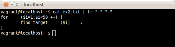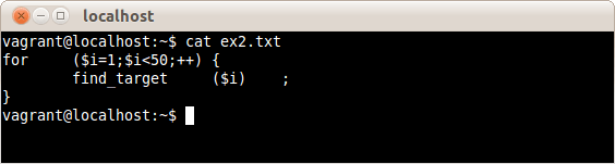$ echo -e "for\t(\$i=1;\$i<50;$i++)\t{\n\tfind_target\t(\$i)\t;\n}" > ex2.txt