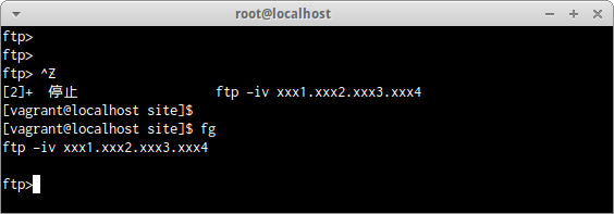 再度FTPを再開したい場合はLinuxコマンドで次のようにfgと入力しよう。