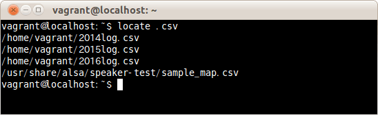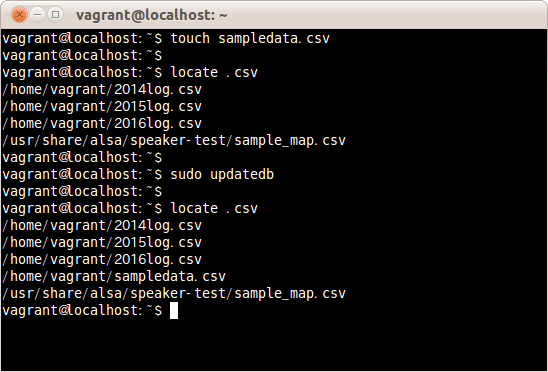 はじめは、直前に追加されたファイル「sampledata.csv」は検索できなかったが、管理者権限でupdatedbコマンドを実行した後にlocateコマンドを実行すると、きちんと検索できている。