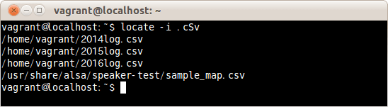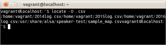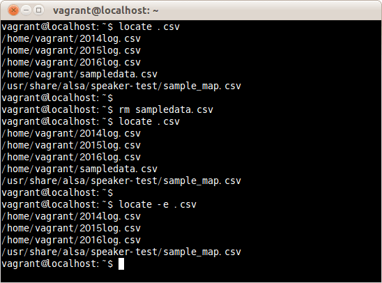 直後に-eオプションでlocateコマンドを実行すると、存在していないファイルsampledata.csvは検索対象とならない。