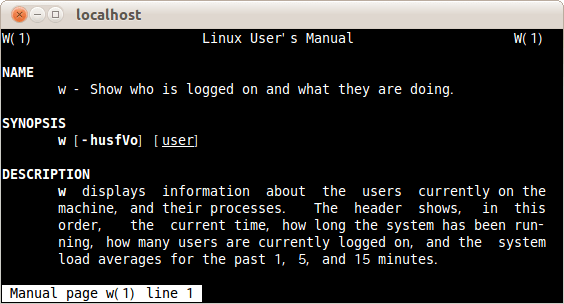 wコマンドのマニュアルが表示された。