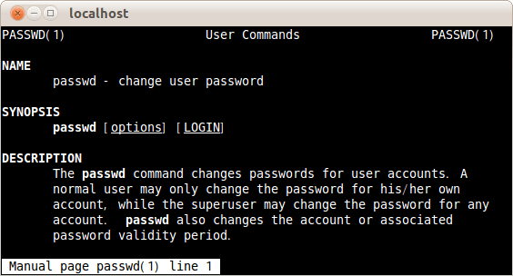 Linuxコマンドのpasswdの使い方マニュアルを表示した。