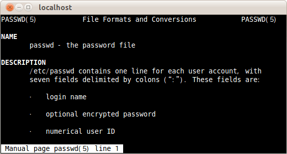 ユーザー情報の入っているファイルpasswdの書式がどうなっているかのマニュアルは次のコマンドで表示する。