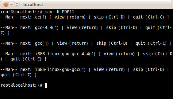 結果、PDP11というキーワードが入ったマニュアルはas(1)、cc(1)、gcc-4.4(1)、gcc(1)、i686-linux-gnu-gcc-4.4(1)、i686-linux-gnu-gcc(1)の6つであった。