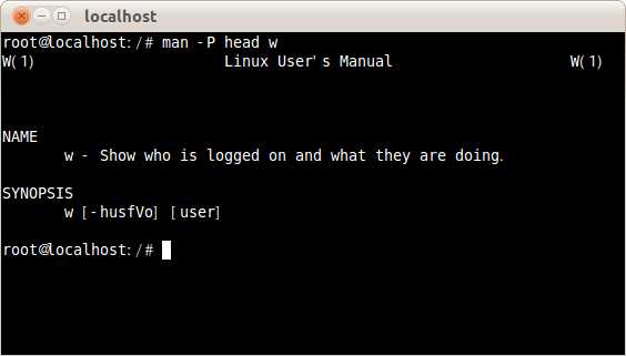 ページャーにheadコマンドを指定してwコマンドのマニュアルを表示するには次のコマンドだ。