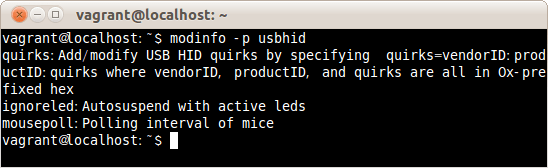 カーネルモジュールusbhidの情報をカーネルモジュールの詳細パラメータのみ表示した。
