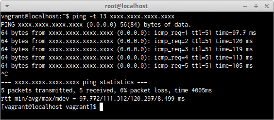 注意したいのは、-tオプションで指定するTTLは通信で消費する上限のTTLの指定であって、実行結果として表示されるTTLは消費されて戻ってきた残りのTTLであるので区別しておきたい。