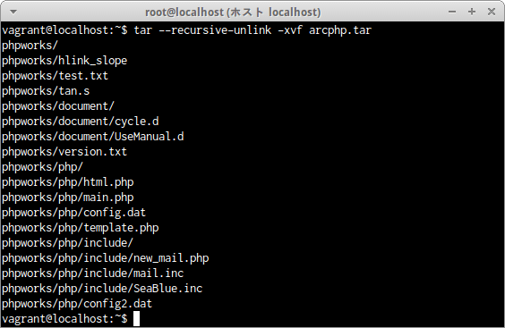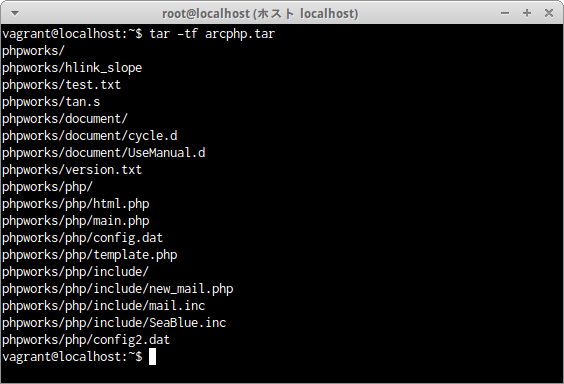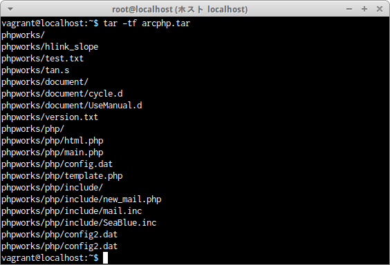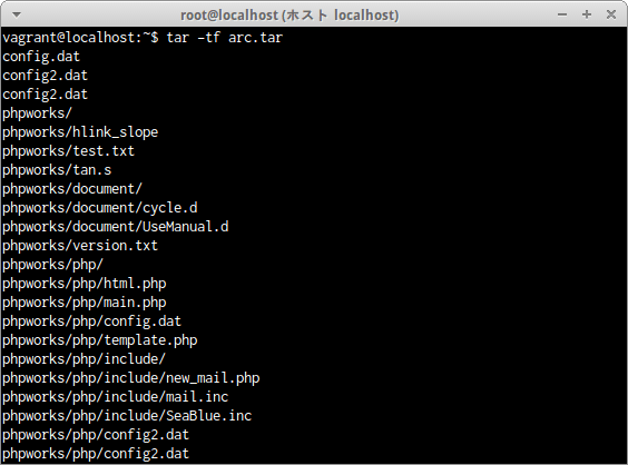 ディレクトリphpworks全体をbzip2形式で圧縮されたアーカイブファイルphp.bz2ファイルの内容を確認するには次のコマンドだ。