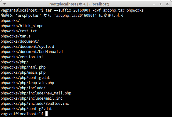 上記コマンドを実行した後に、lsコマンドで指定のアーカイブファイルが出来ているか調べた画面だ。