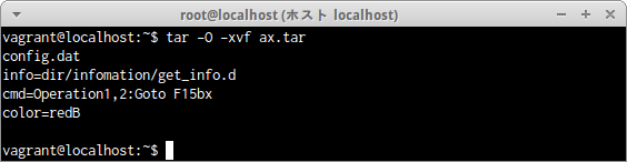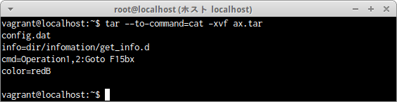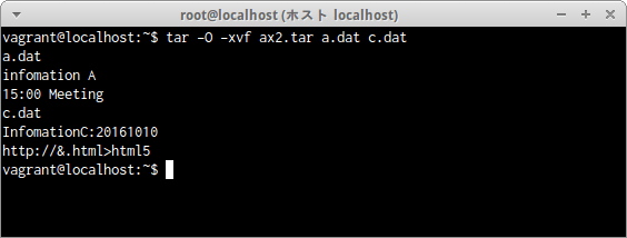 アーカイブファイルax.tar内のファイル内容の中のa.dat及びc.datの内容が標準出力に表示された。