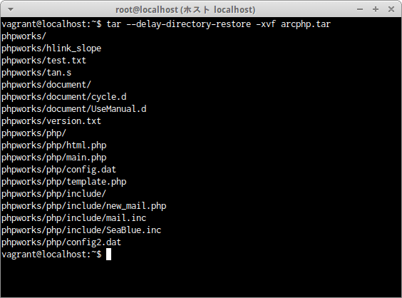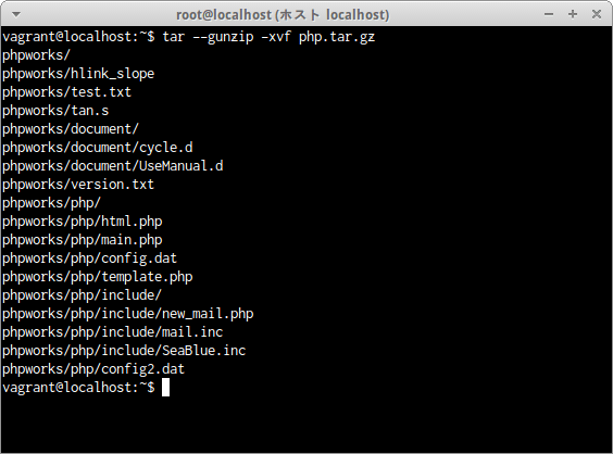 ディレクトリphpworks全体がgzip形式で圧縮されたアーカイブファイルphp.tar.gzが解凍された。
