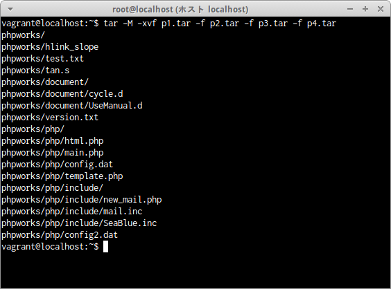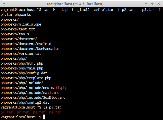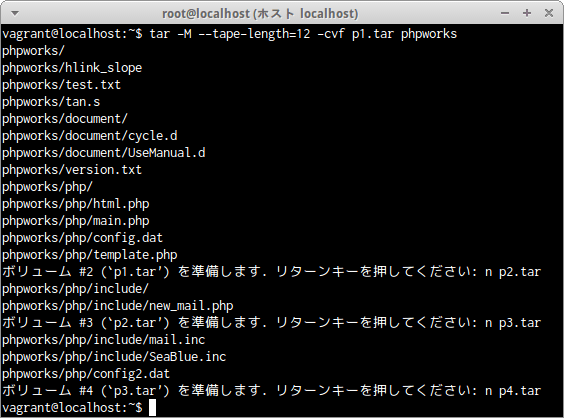 ディレクトリphpworksの内容を、ファイルp1.tarからp4.tarまでの4つのファイルに1ファイル12kByteで区切り分割する場合は次のコマンドだ。