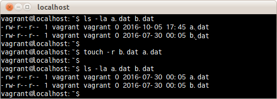 はじめは10月5日17:45だったファイルa.datのタイムスタンプが上記コマンド実行後、ファイルb.datのタイムスタンプ7月30日00:05に変更になった。
