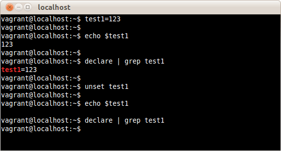 declareコマンドで変数test1を検索しても登録自体がなくなっていることが確認できる。