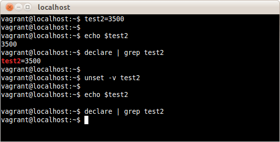 declareコマンドで変数test2を検索しても登録自体がなくなっていることが確認できる。