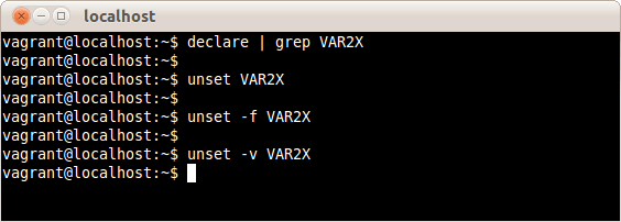 そこで、オプションなしのunsetコマンド、-fオプション付きのunsetコマンド、-vオプション付きのunsetコマンドを実行するが、エラーメッセージの表示はない。