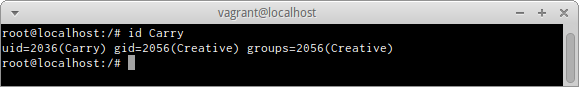 ユーザーCarryの副所属グループに「Moderator」が「Creative」とグループ番号(GID)が「1050」に変更されている。