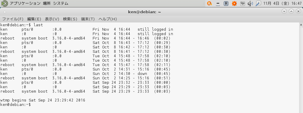 ユーザが最後にログインした履歴を表示する。なにもオプションを設定しない場合は全ユーザの最終ログイン日時が表示される。一度もログインしたことのないユーザについては"**Never logged in**"もしくは**一度もログインしていません**と表示される。