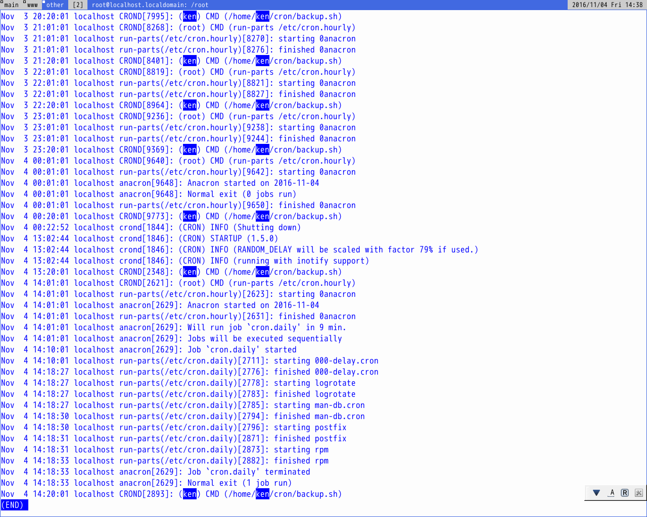 Nov 3 14:17:00 localhost su: (to root) ken on /dev/pts/1