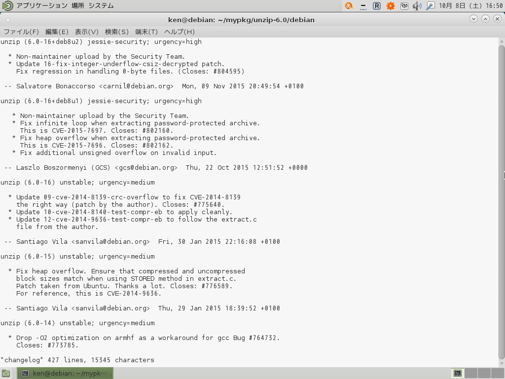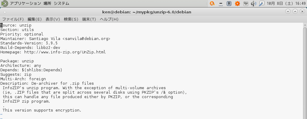 ソースディレクトリ内に「debian」というディレクトリが存在するのがわかると思う。このなかにパッケージ作成のための、「レシピ」が収まっている。