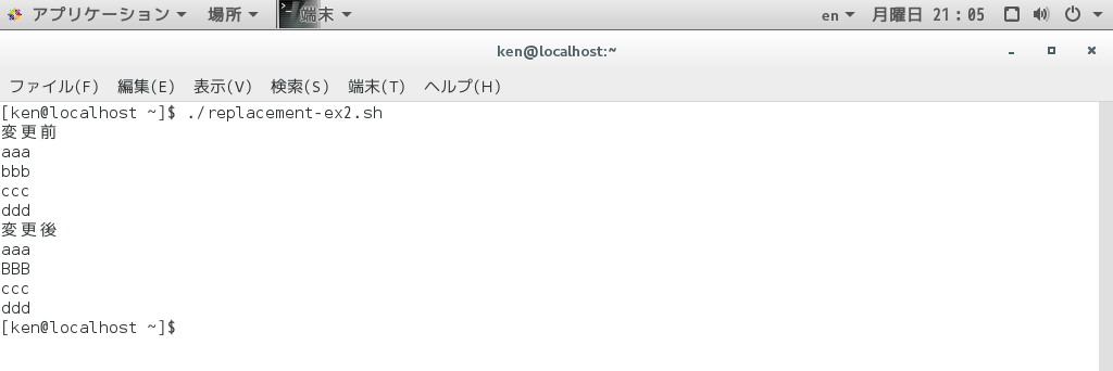 #!/usr/bin/bash echo "変更前" cat data.txt echo "変更後" sed -e 's/bbb/BBB/g' ./data.txt > ./data-new.txt cat data-new.txt |