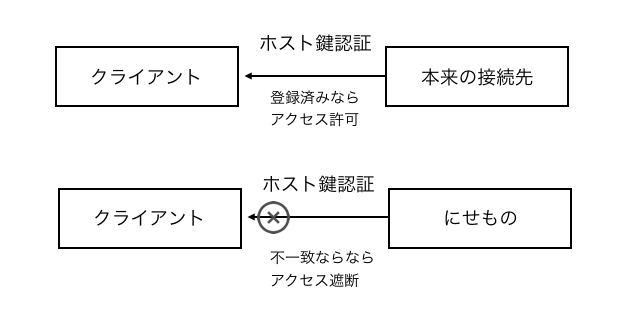 SSHではユーザ認証の他にホスト認証というものを行なう。このホスト認証はサーバの正当性を確保するための認証だ。「そのホスト(サーバ)が本当にログインするべきサーバなのか?」を確認する。