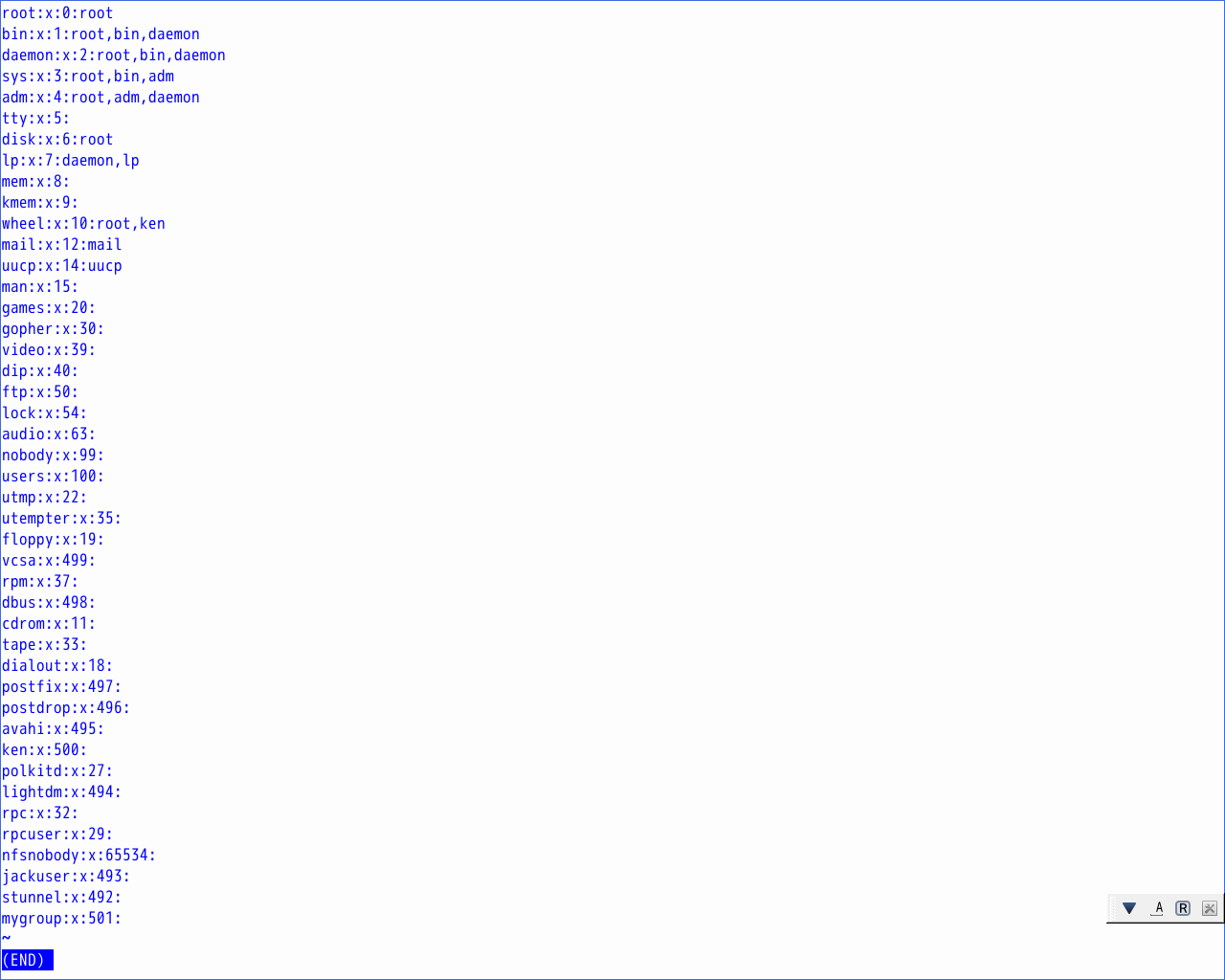 おそらく一番下の行に作成したグループが登録されているはずだ。3番目のカラムに番号が割り当てられていると思う。これは「/etc/psswad」ファイルにあった「ユーザid」と同じ役割をもつ「グループid」というものである。