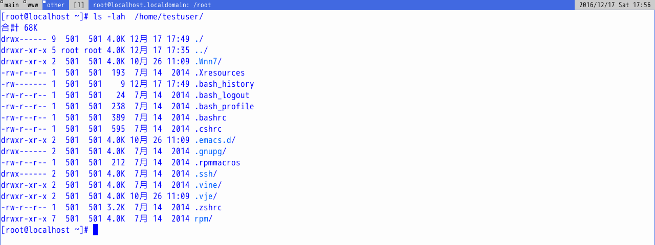 多数のファイルの存在が確認できるはずだ。「Cntrol+d」を押して、もとのrootユーザへもどる。この状態でtestuserとそのグループだけを削除したらファイルはどうなるのか?確認してみよう。