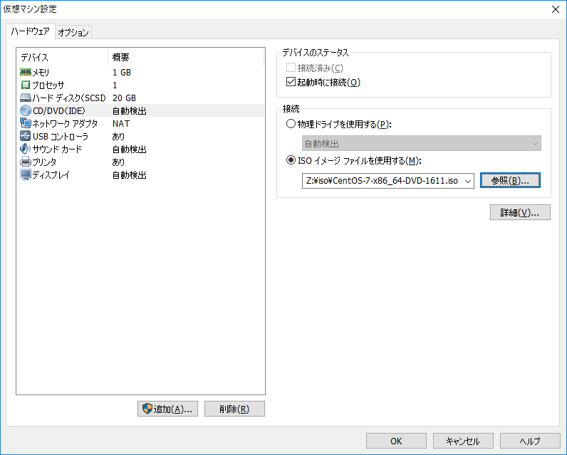 「CD/DVD(IDE)」へ移動「ISOイメージファイルを使用する」を選択し、「参照」でCentOSのISOを指定する。「OK」をクリック。
