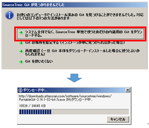 「Gitが見つかりませんでした」の画面が表示されたら、「システム全体でなく、SourceTree単独で使うためだけの内蔵用のGitをダウンロードする。」を押す。