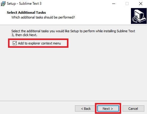 (3)エクスプローラのコンテキストメニュー(右クリックメニュー)にSublime Textを追加するかどうかの確認が表示される。追加する場合は「Add to explorer context menu」をチェックして「Next>」ボタンをクリックしよう。