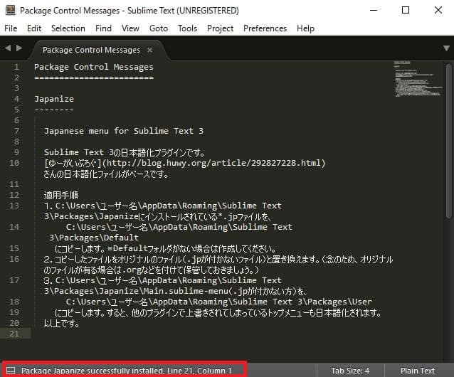 SublimeTextの最下段に「Package Japanize successfully installed.」と表示されればインストールは完了だ。SublimeTextにJapanizeの適用手順について説明が表示されるので、その通りに設定を行おう。