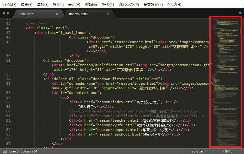 画面右側にファイルのどのあたりを表示しているのかを示してくれるミニマップが表示される。地味な機能だが、長いプログラムソースを編集するときなどに割と重宝する。
