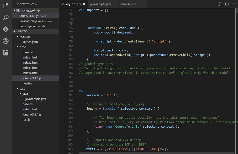 - エクスプローラー:開いているファイルを一覧表示する。
