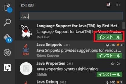 「Language Support for Java(TM) by Red Hat」の覧に表示されている「インストール」ボタンをクリックして、拡張機能のインストールしよう。