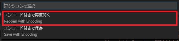 (2)エディタ上部のコマンドパレットに文字コード関連のコマンドが表示されるので、「エンコード付きで再度開く」を選択する。