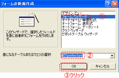 【6】「フォーム ウィザード」、「t01prefecture」を選択し、「OK」ボタンをクリックします。