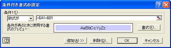 「数式が」を選択し、ボックスに =$A1=$B1 (A1とB1がイコールなら) の式を入力 (列は固定する必要があるので絶対参照にし、行は式をコピーする必要があるので相対参照にします。)