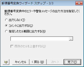 変換中のエラー内容(存在しない郵便番号が入力されている場合など)の表示法を指定して「完了」をクリック