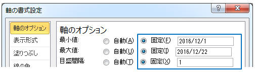 「最小値」と「最大値」を日付(yyyy/mm/dd)の形式で入力し、目盛り間隔を1(任意)にする