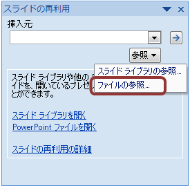 「参照 ▼」をクリックし、「ファイルの参照」をクリックして挿入元のファイルを指定